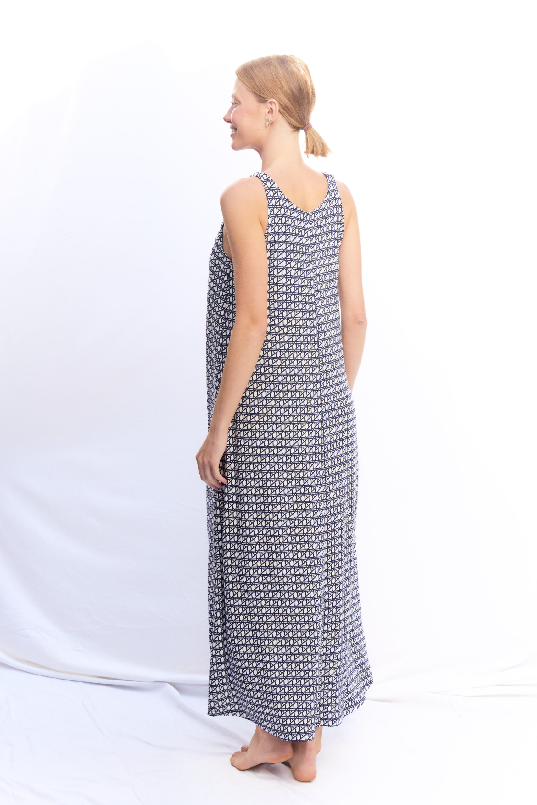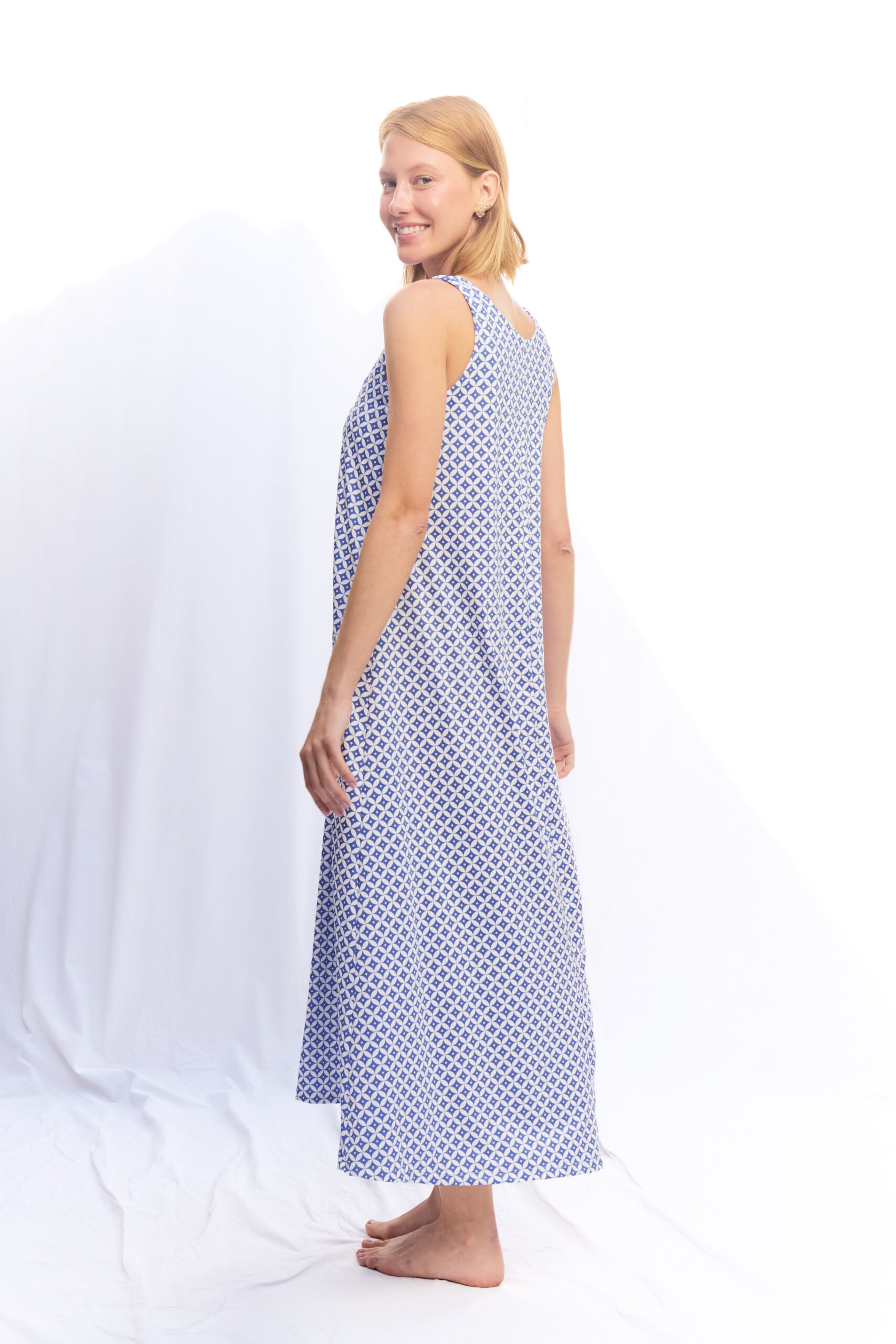 VESTIDO OLIVIA LYCRA BLANCO AZUL GEOMÉTRICO