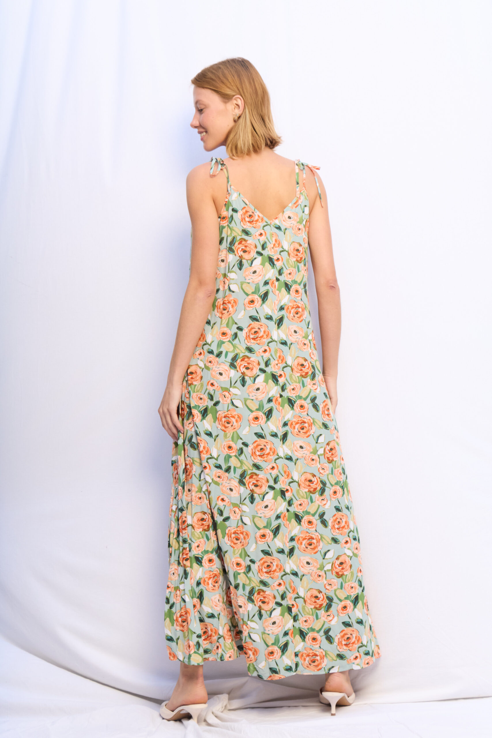 VESTIDO LUCY VERDE AGUA ROSAS NARANJAS