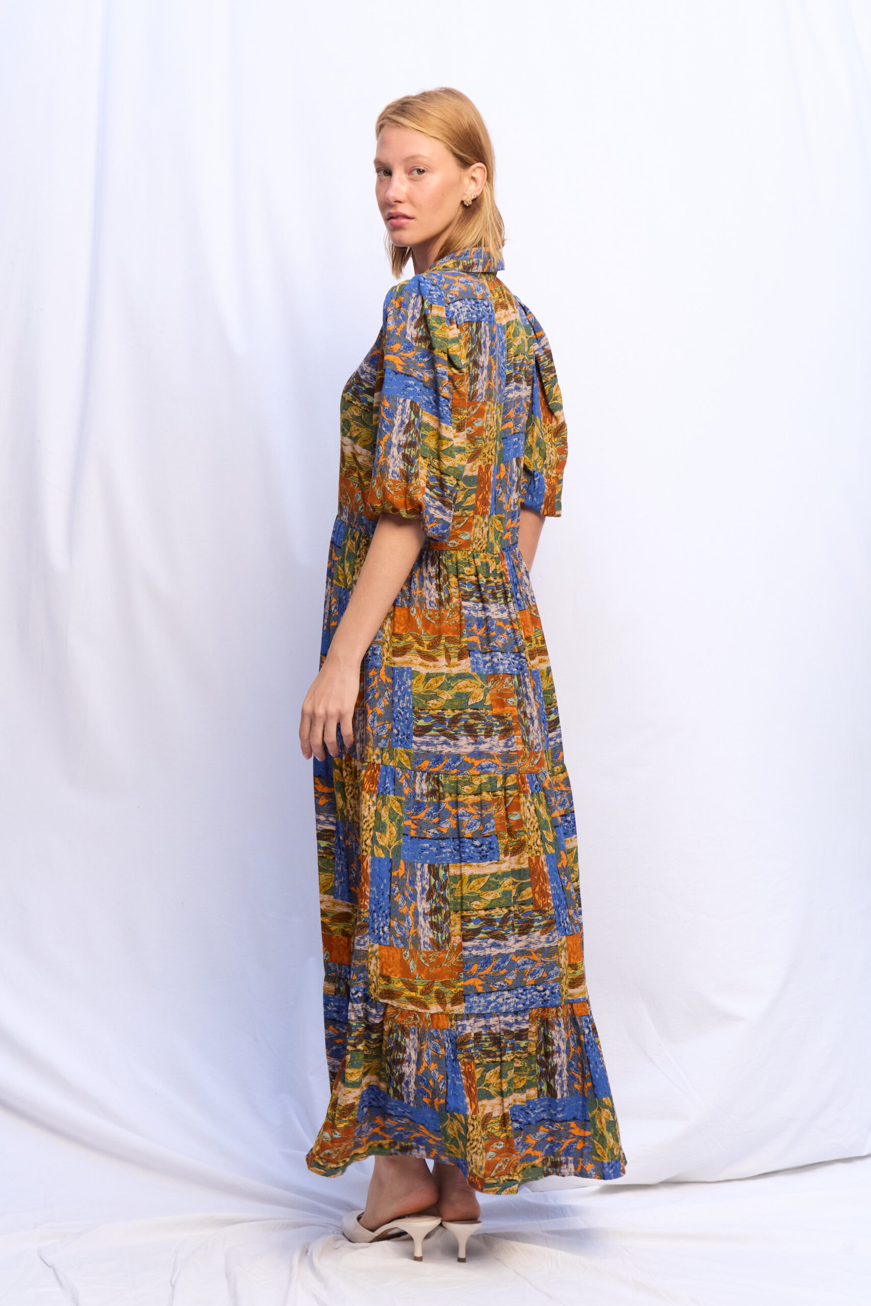 VESTIDO AMANDA AZUL HOJAS MULTICOLOR