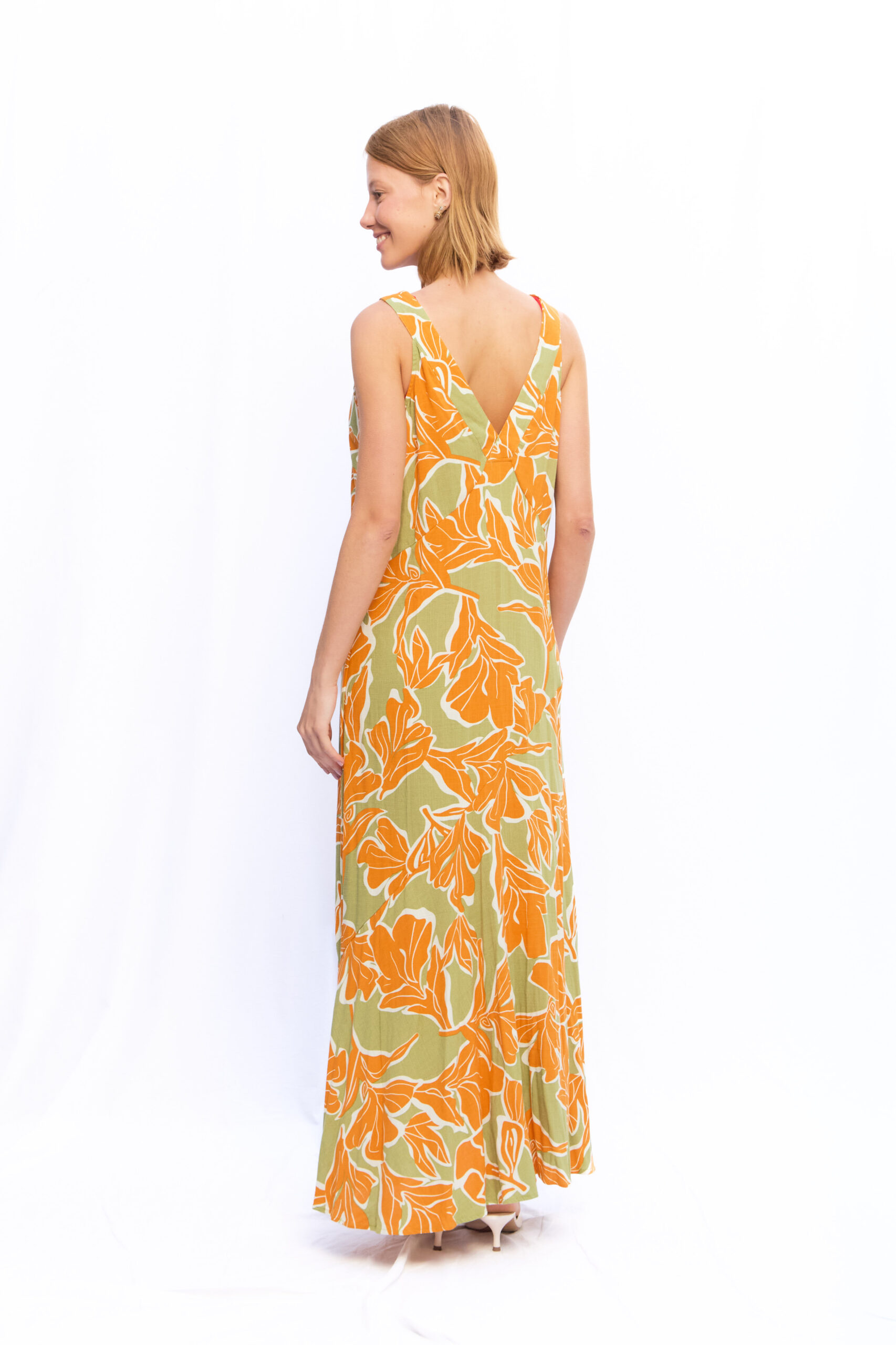 VESTIDO ANNIE VERDE OLIVA FLORES NARANJAS
