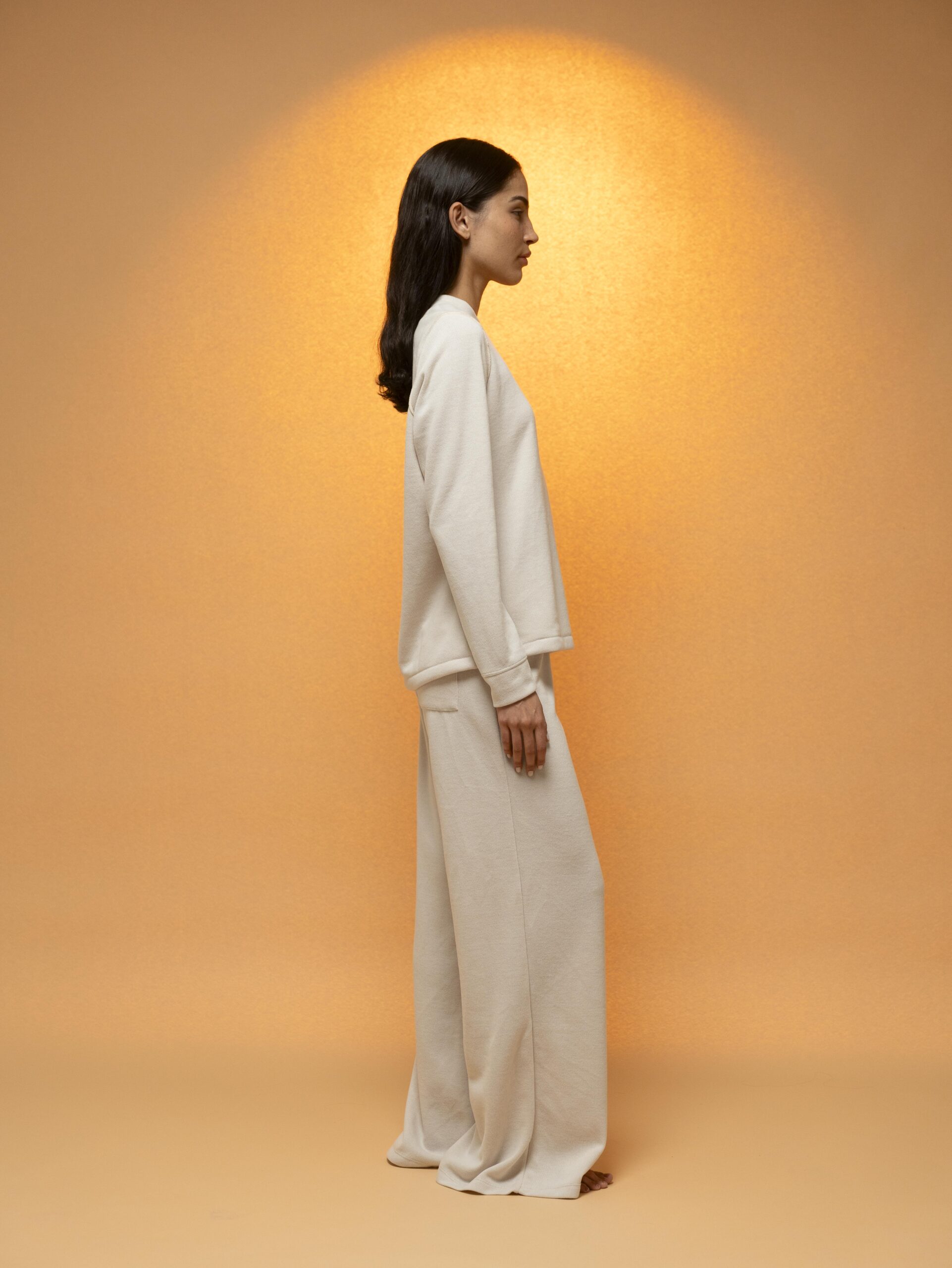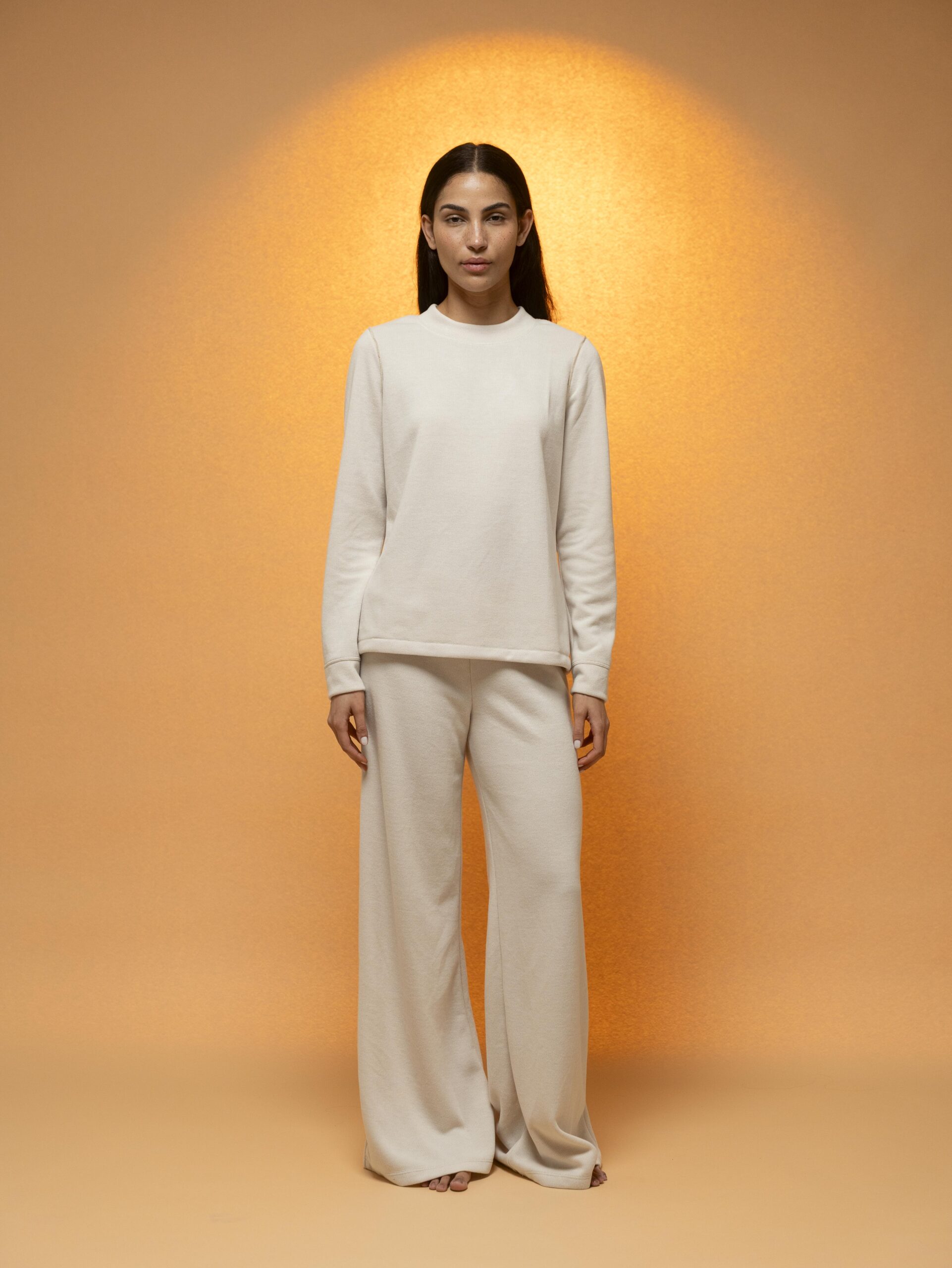 Set minimalista en tono arena con silueta relajada y pantalón acampanado que estiliza. Dos bolsillos traseros y comodidad absoluta, perfecto para días relajados o salidas casuales.