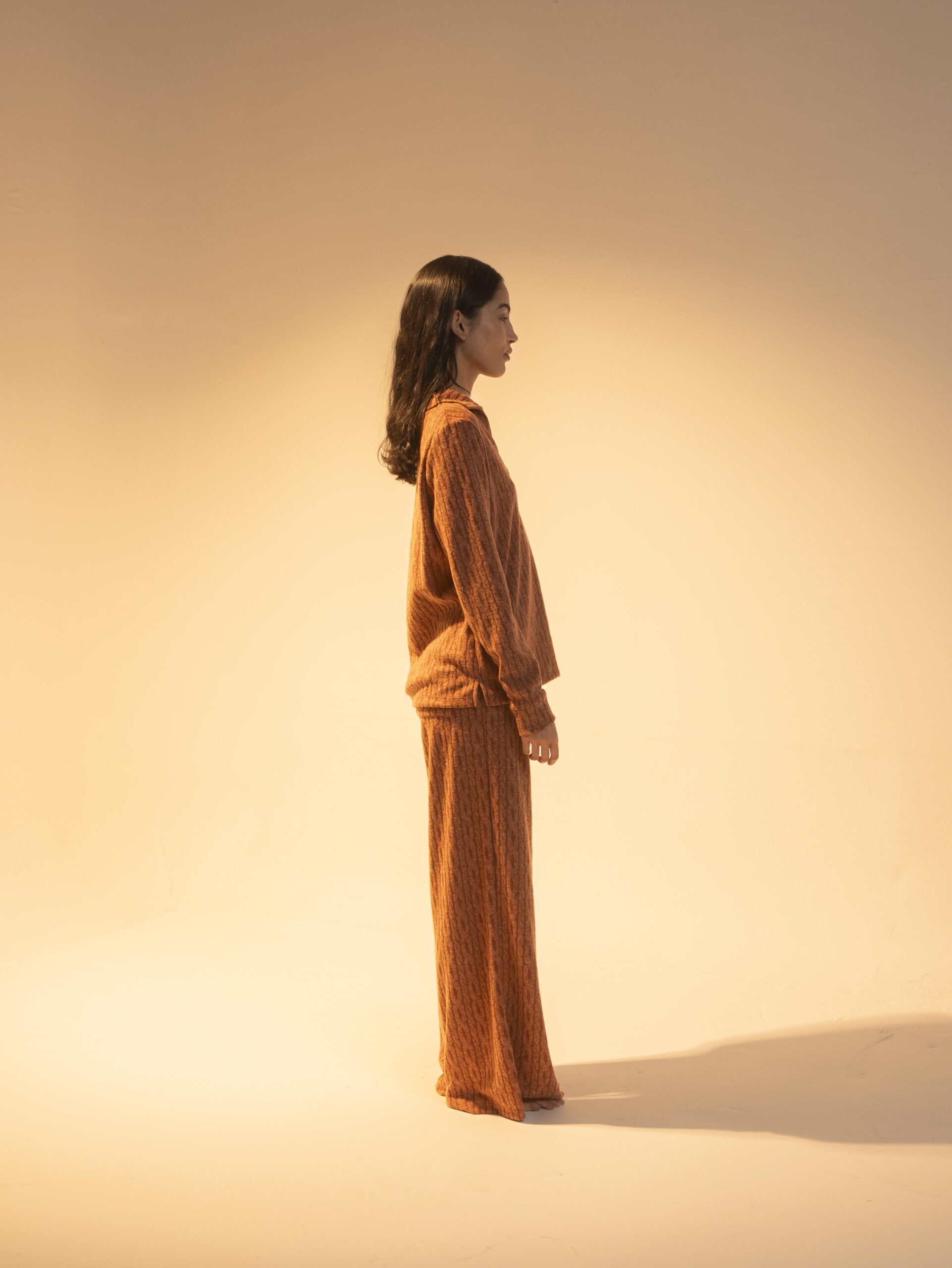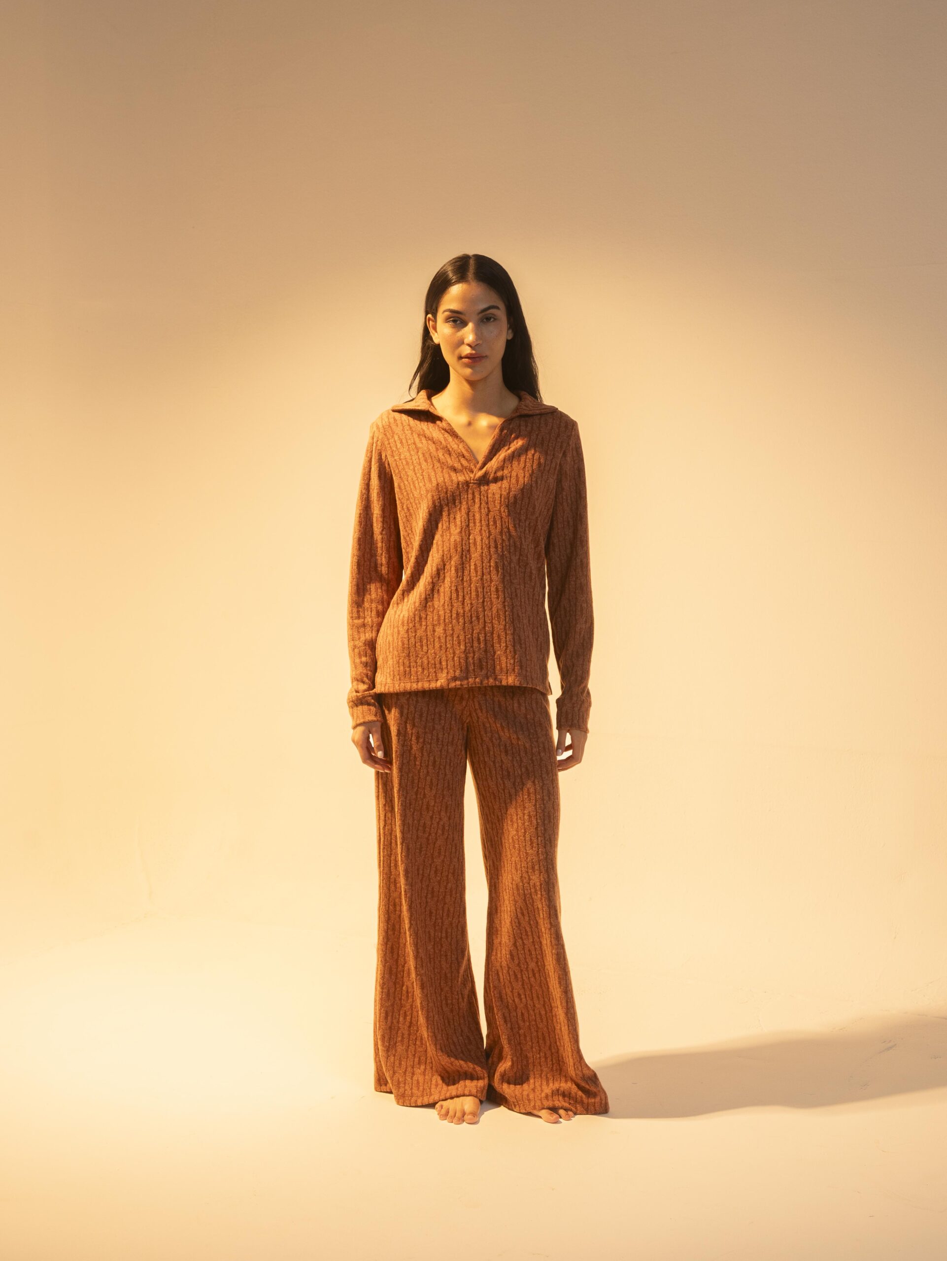 Tono cálido inspirado en la tierra, con textura sutil y pantalón acampanado de caída fluida. Incluye dos bolsillos traseros, ideal para un look cómodo con carácter en el día a día.